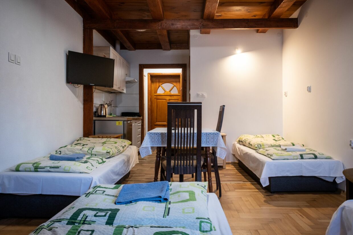 Idealny pokój dla znajomych lub rodziny. W pokoki znajdują się cztery pojedyncze łóżka, prywatna łazienka oraz aneks kuchenny. Pokój ma około 20m2. Chcesz zarezerwować? Dzwoń na 601092800.